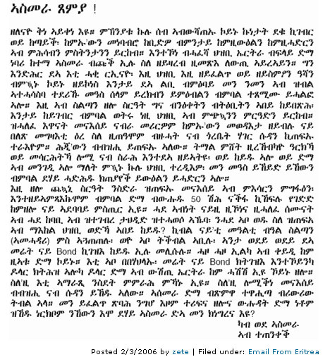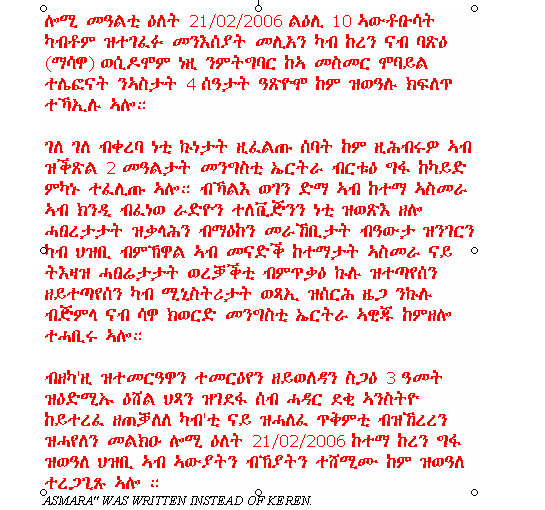 It all started when pupils were having lessons in their class rooms, when troops unexpectedly arrived, and instructed students up to the 6th grade to come out and board the buses. Following the rounding up, 10 buses full of students were seen taking them away to Masawa. Moreover, married women with no children, and those with children up to the age of 3 years, have also been rounded up in today's government action. Today's rounding up in Keren was reported to be worst than the one in October 2005, both in its rigidity and brutality. In order to carry out the rounding up quietly, mobile phone networks were disconnected by the government for about 4 hours. Reliable sources have reported that there is a planned 2 more days of intensive rounding up of citizens in the near future. In a different government action in Asmara, it has been