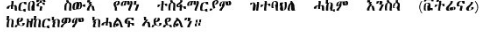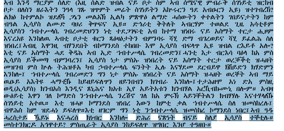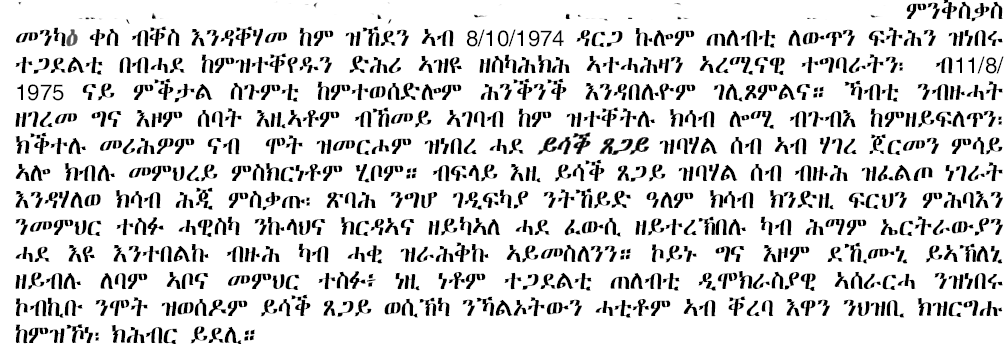 ወላ ኣብቲ ዝዋሃብ ዝነበረ ኣተዓዳድላ ናይ ቅያድ ኣልዓማ፥ 38 ክምረጹ እንከለዉ ካብዚኦም 3 ክርስትና ጥራይ እዮም ኣትዮም ነይሮም፥፥ ዳሓር ካኣ ክርስትያን ኣብቲ ግዜ ኣንድነት፥ ክርስትያን እዮም ኣንድነት ምስ ኢትዮፕያ፥ ዝብሉ ዘለዉ መኽንያቱ ክርስትያን ስለዝኾነት ኢትዮፕያ፥ እንዳበልካ ኣብልዕሊኦም ማእለያ ዘይብሉ ግፍዕታት እዩ ተፈጺሙ፥፥ ሕጂ ምስከምዚ እታ ንሕናን ዕላማናን፥ ኣብ ምንቕቓሕ ናይቶም፡ዝስለፉ ዝነበሩ ዓቢ ተራ ነይርዋ'ዩ፥፥ ዝእመን ሓቅታት እዪ ነይርዋ፥፥