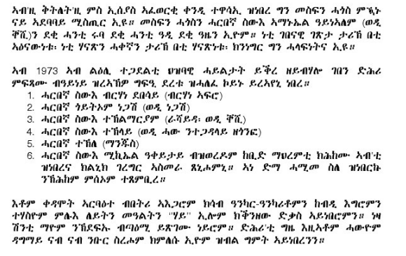 | Teklay Aden, member of the central committee and an EPLF security chief who defected to the Ethiopian regime in 1981, described Halewa Sewra in the following: The most criminal and notorious organ within the EPLF is known as 'Halewa Sewra or the security department. This is the Gestapo section in the EPLF assigned with the task of arresting, torturing and killing elements who oppose the leadership clique. It is a brigade of terror and death led by two members of the central committee. ('I was one', according to the March issue 81) The department which has no clear-cut guidelines save for the carte blanche to kill, is divided into three sections A.The Surveillance Section: This body is responsible for covering the whole EPLF with a network of agents reporting on each other. EPLF is an orgnization in which every member takes the other for an agent and therefore has to keep his mouth shut. I can only say that the situation inside the group defies any description in words. The majority of the security agents are somehow attached to the leadership clique. B.The Interrogation Section of 'Halewa Sewra' is a place where all types of untold brutalities recommitted against suspects. Any person accused of opposing the leadership or the EPLF in general is scaled with boiling oil; refused food or water for a long period and forced to sleep over his/her refuse. The fascistic crimes perpetrated against the innocent victims do really drive one mad.; The majority of the suspects die while undergoing 'questioning'. C.The Prison Section: This is the section which physically liquidates 'enemies' of the EPLF or demoralizes the victims. The prison inmates are not only refused the basic food and medical needs, but are daily subjected to terrorization and self-defacement. Practically none of the survivors of the continued mental and physical torture in the prison can be described as 'survivors'. The firing squads are also stationed in the prison; their assignment is to kill by firing bullets. |