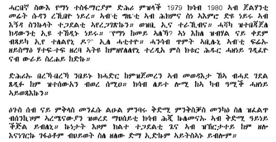 ዝኾነ ኾይኑ : ከምዚሎም : ዝዓበዩ : እቲ ጽቡቅ ናብራ : ዘለዎ : ከም ጸላኢኦምዮም : ዝወስድዎ :: ድሐር ፈጺመ : ገዲፈዮ : ናብታ ላውንድሪ : ምኻድ : ማዓስ ከም ዝኸደ ናብ ገድሊ : አይፈልጥን ግን 1969 ክኸውን አለዎ :: አብ ሜዳ እንተ ዝረኽበኒ : ምስ ሐረደኒ : ንቴድሮስ : ዓሊ ጋዝ ዝገበሮሞ :: source taken fromMichael Abatregh facebook